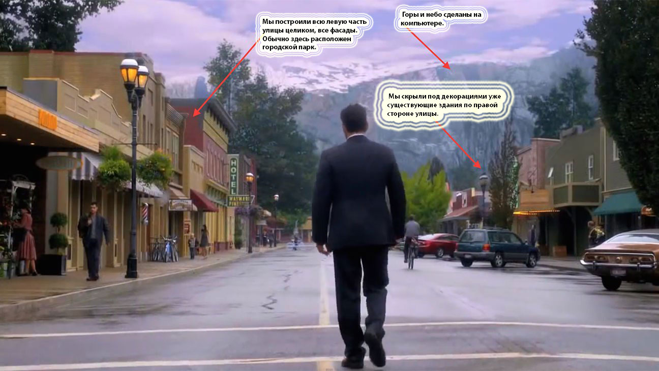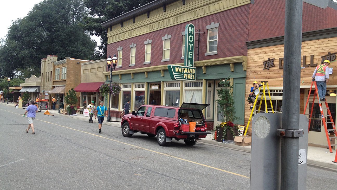 Это фото отлично иллюстрирует то, сколько работы было вложено в создание Уэйуорд-Пайнс. Декораторы выстроили городок за три недели, возводя фасады зданий и покрывая уже существующие постройки. Затем присоединилась команда по созданию визуальных эффектов, чтобы кое-что дорисовать и улучшить, а также придать картинке сюрреалистичную цветовую гамму.