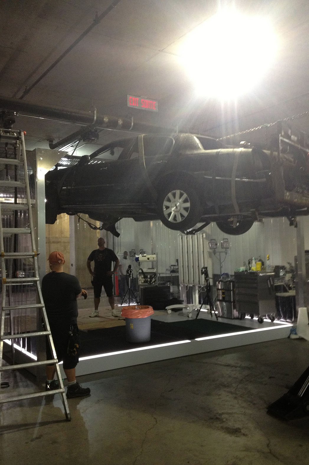 «Когда я писал сценарий первой серии, я уже точно знал, что хочу включить в него сцену, где агенты секретной службы в Сиэтле осматривают машину Итана после аварии. Я без понятия, как у них это все обычно происходит, поэтому я просто написал: «Покореженный седан висит в воздухе на аналитических тросах и группа технических специалистов осматривает обгоревший каркас». И они взяли и построили все это! Ну, скажите на милость, что такое «аналитические тросы?» Кто-нибудь знает? Видимо, как раз вот это они и есть!» – радуется Ходж, указывая на фотографию.