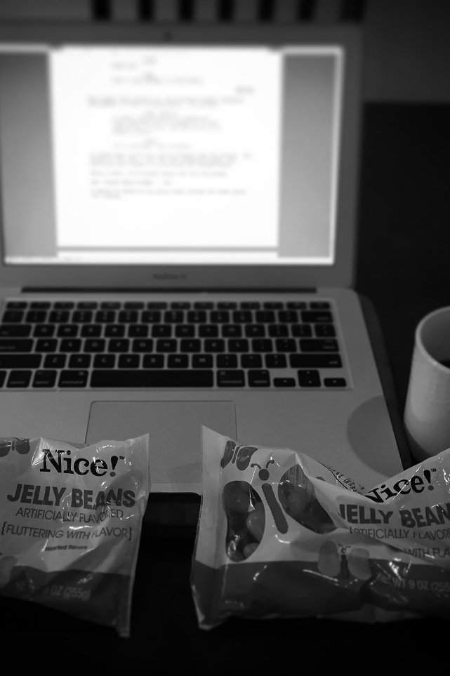 «Примерно так я обычно и пишу», – говорит Ходж, демонстрируя фото с ноутбуком, чашкой кофе и двумя пакетами жевательных конфет.
