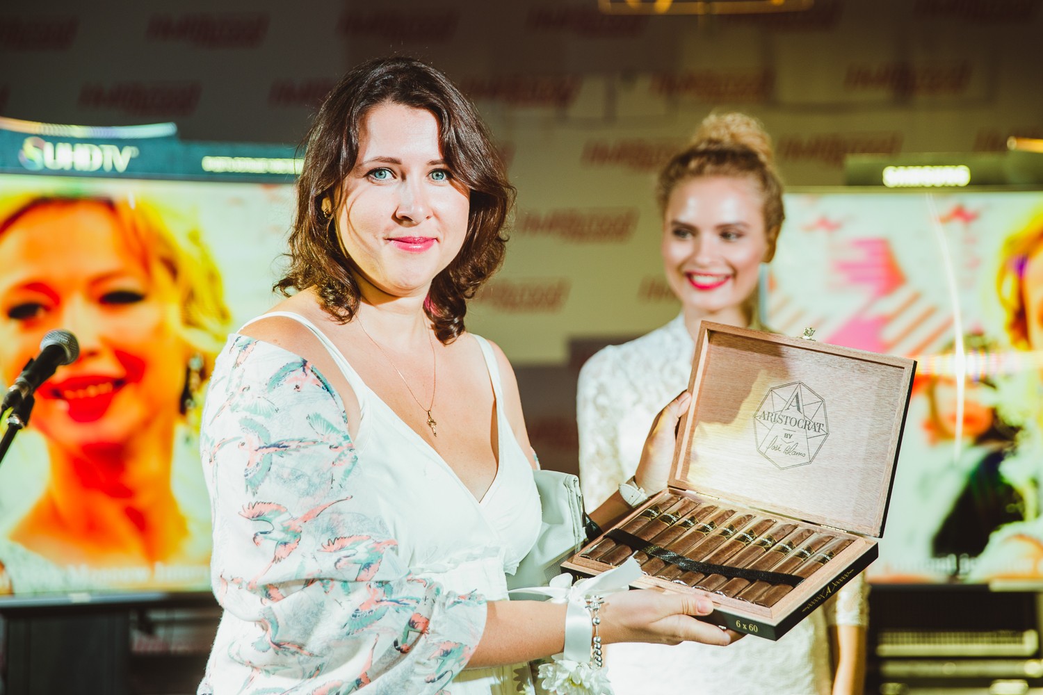 Главный редактор THR Мария Лемешева и исполнительный директор Алексей Говорухин представили три лота. Первый — уникальные сигары Aristocrat by Jose Blanco, произведенные на старейшей никарагуанской фабрике Joya de Nicaragua под руководством легендарного мастера Хосе Бланко, — приобрела сотрудница Фонда кино Светлана Бриллиантова.