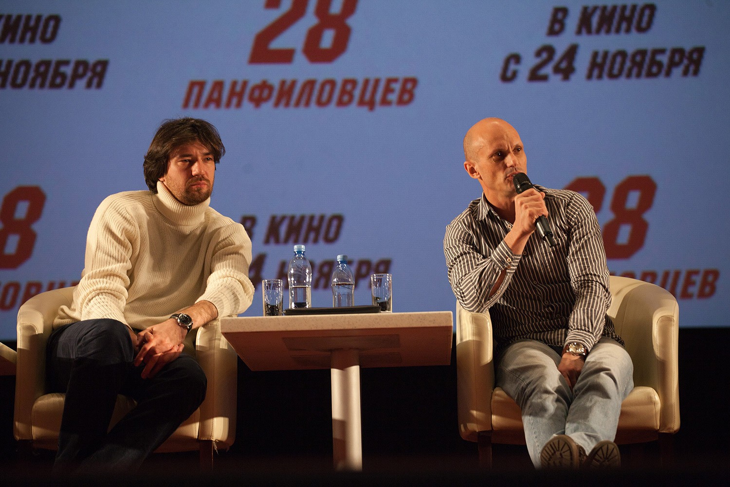 Режиссеры Ким Дружинин и Андрей Шальопа на пресс-конференции Ольга БеликАндрей Шальопа и команда фильма представили картину журналистам и рассказали, стыдно ли им перед народом за пожертвованные деньги.В Москве журналистам показали «28 панфиловцев»: фильм, прославившийся задолго не то, что до презентации – до съемок. Режиссер Андрей Шальопа – не из мира кино. Начальную сумму на съемки он собрал с помощью краудфандинга – то есть простой народ жертвовал на идею кто сколько мог. Насобирали 35 миллионов рублей – непобитый никем рекорд. Как говорит Шальопа, эта сумма – пятая часть всего бюджета, но без нее ничего бы не было. Увидев такую народную жажду сделать фильм о панфиловцах, Министерство культуры России, а затем и Казахстана выделили средства – в итоге бюджет картины составил 150 миллионов рублей. Все, кто помог картине состояться, внесены в титры: Министерства перед началом, а народ – все 30 с лишним тысяч – на финальных 20-минутных титрах.