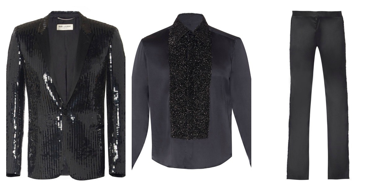 Пиджак Saint Laurent, сшитая на заказ рубашка к смокингу и брюки.