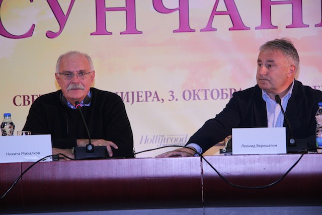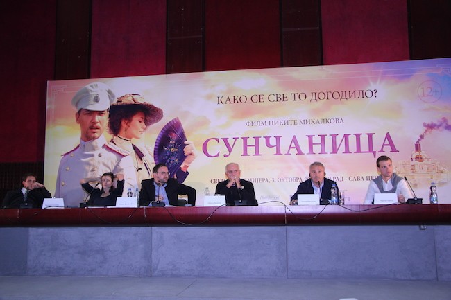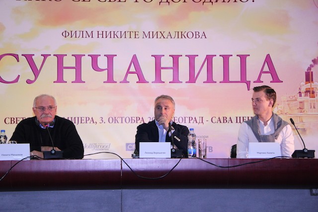 На пресс-конференции по фильму «Солнечный удар» перед премьерой в Белграде, помимо режиссера картины Никиты Михалкова, присутствовал продюсер фильма Леонид Верещагин, а также актеры Виктория Соловьева, Мартиньш Калита и Милош Бикович. Пресс-конференция собрала более сотни журналистов, большинство из которых были сербскими. Общение с прессой шло почти полтора часа, и THR предлагает вам ознакомиться с некоторыми из тем, затронутых в ее ходе.