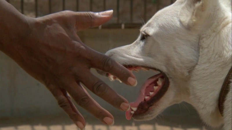 Кадр из фильма "Белая собака". Большинство существующих фильмов о животных посвящено, разумеется, «другу человека», собаке. Основная их часть – это слёзовыжималки вроде «Хатико» или истории о служебной кооперации в духе безумно популярной некогда в России «К-9: Собачьей работы». Однако есть и такие, где собаки перестают быть верными сподвижниками и оказываются существами с куда более сложной и трагической внутренней жизнью. Одна из самых ярких лент такого рода – «Белая собака» Сэмюэла Фуллера, одарённого американского режиссёра с непростой судьбой, так и не получившего широкого признания на родине. Фильм, снятый по роману французского писателя Ромена Гари, рассказывает о белой швейцарской овчарке, натренированной для нападения на всех чернокожих, попадающих в её поле зрения, и о попытках тренера-афроамериканца отучить её от этого рефлекса. Картина так и не вышла на экраны в США из-за опасений студии Paramount, что влиятельные организации цветного населения устроят ей бойкот. Таким образом зрители пропустили в свое время мощнейшее высказывание против расизма, куда более глубокое и бескомпромиссное, чем большинство осыпанных лаврами картин на данную тему.
