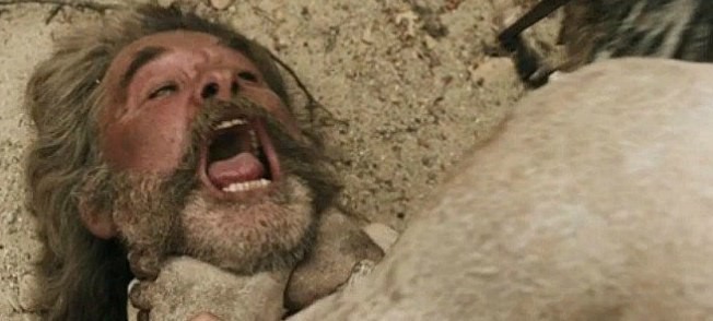 Кадр из фильма «Костяной томагавк». Последние полчаса переворачивают уже устоявшееся мнение с ног на голову – в пещерах начинается настоящий «Ад каннибалов» с кровью и кишками. «Костяной томагавк» приносит и другие сюрпризы и неожиданности: замечательный Питер Дженкинс, например, не умолкает ни на минуту и рассказывает одну историю за другой, почти как Сергей Пахомов в «Зеленом слонике», малоприятный поначалу охотник за головами Фокса оказывается человеком с несгибаемым внутренним стержнем, а физически слабый персонаж Уилсона превращается в супергероя. Также в фильме мелькает много приятных лиц – от уже упомянутого Сида Хэйга, героя блэксплотейшенов, вытащенного из небытия Робом Зомби, до Занна МакКларнона, колоритного индейца из второго сезона «Фарго», Майкла Паре и Шон Янг. Один только Рассел предстает во вполне традиционной роли покорителя фронтира, но ему ничего другого играть и не надо – он прекрасен такой, какой есть.