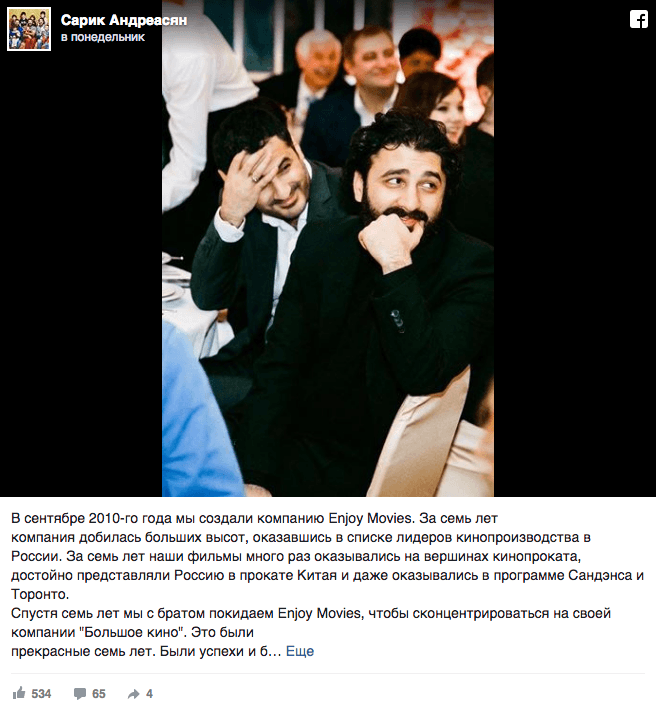 Сарик Андреасян объявил об уходе из Enjoy MoviesСарик Андреасян объявил об уходе из Enjoy Movies
