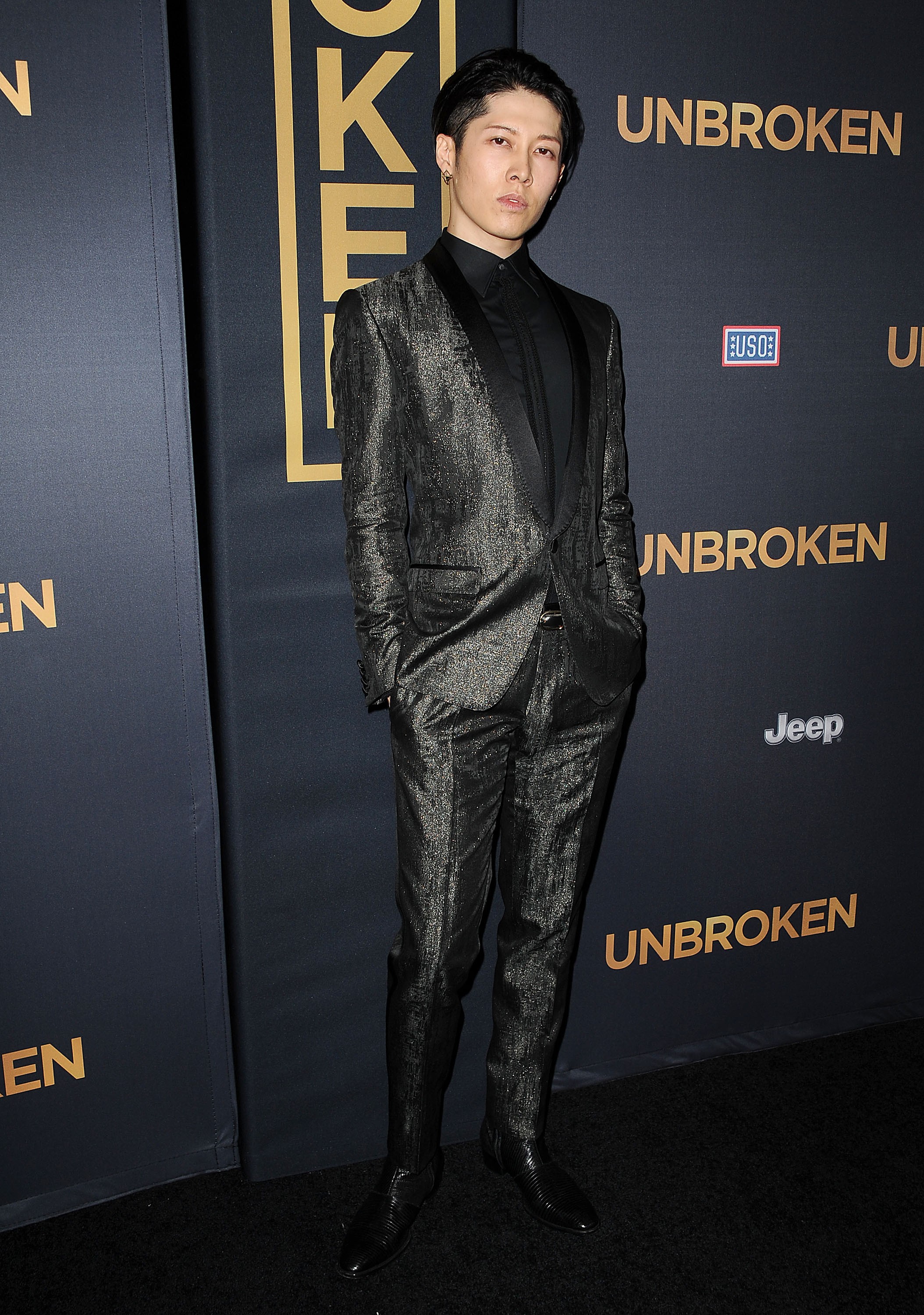 Известный стилист Джин Янг хотела подчеркнуть рокерскую натуру актера сверкающим черным ансамблем, в котором он появился на премьере «Несломленного» 15 декабря в Лос-Анджелесе,.