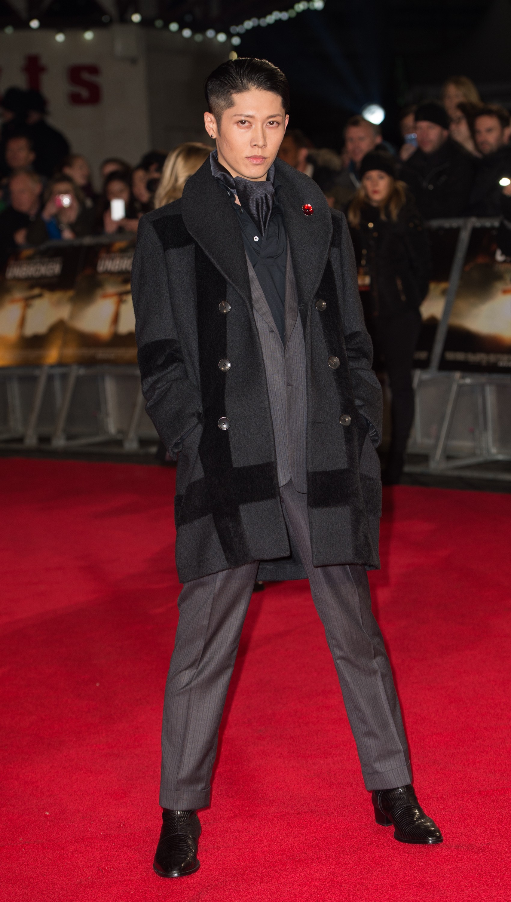 На лондонской премьере «Несломленного» 25 ноября Мияви позировал фотографам в ансамбле от Ermenegildo Zegna.