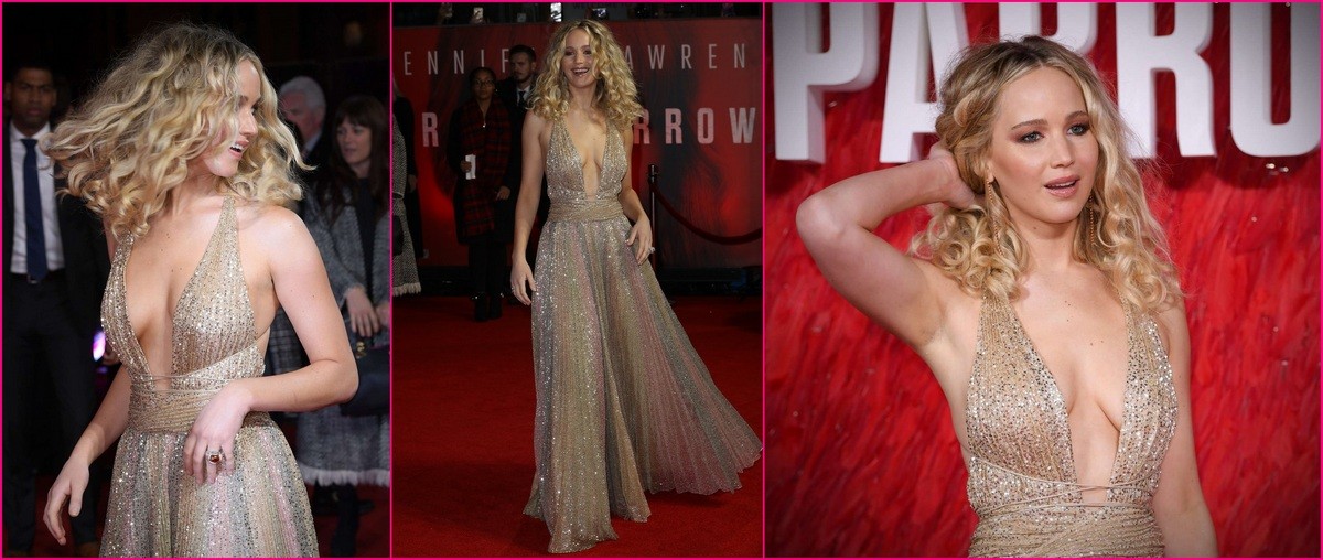 На премьеру в Лондоне пришел основной актерский состав картины (не было лишь Рэмплинг) – но главной звездой, безусловно, стала Дженнифер в откровенном платье на бретельках от Christian Dior – актриса является рекламным лицом этого бренда. Помимо голой спины и глубокого декольте Лоуренс демонстрировала всем серьги-нити и массивное кольцо.