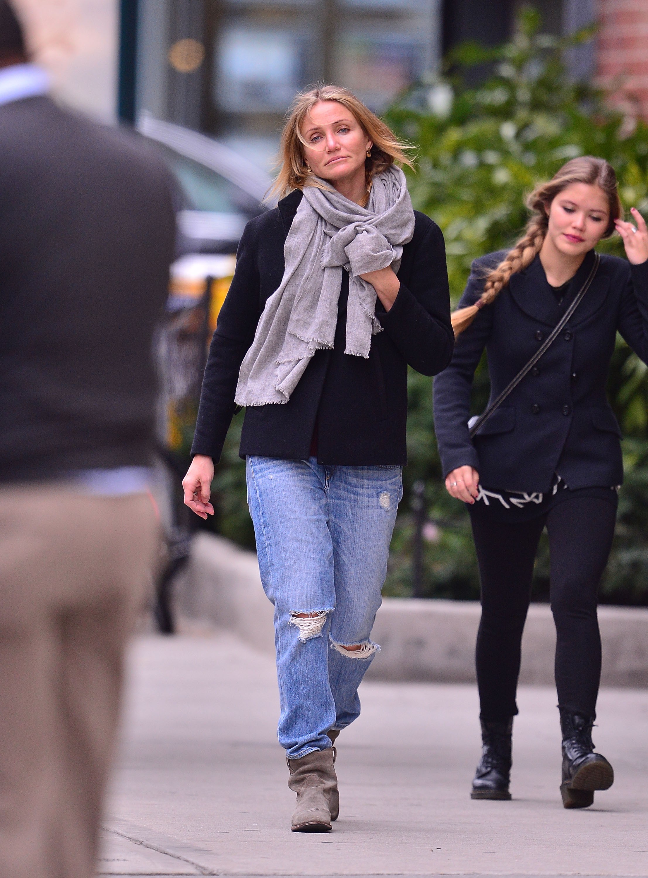 Но это не так, и любимый образ Кэмерон для городских прогулок: черный жакет, объемный шарф, джинсы и удобная обувь.