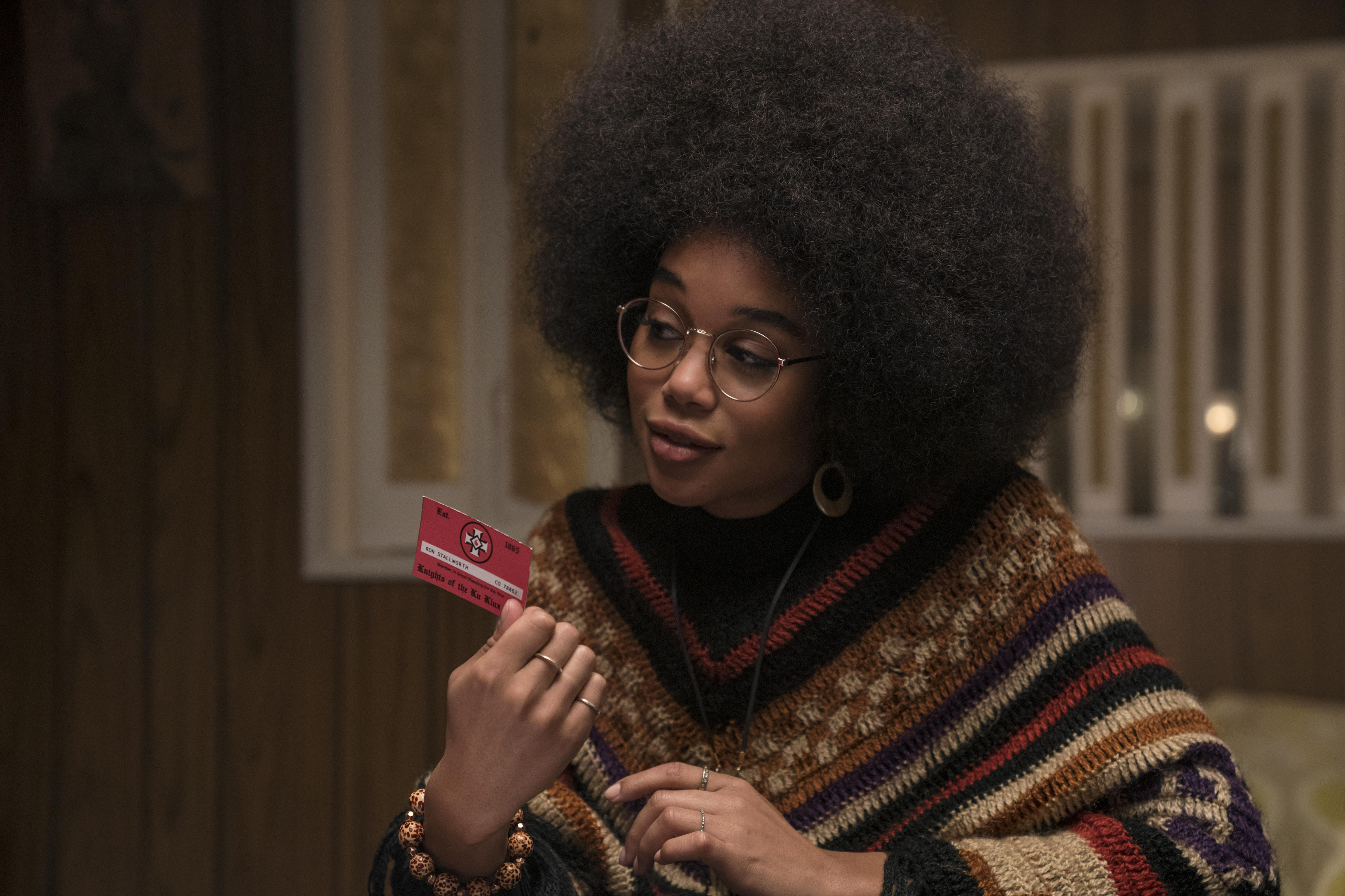 Кадр из фильма «Черный клановец» При создании костюмов для возлюбленной Рона, активистки Патрис (Лора Хэрриер), художница вдохновлялась образами реальных борцов за права темнокожих: экс-члена Партии черных пантер (организация, которая продвигала гражданские права темнокожего населения, — THR) Кэтлин Кливер и феминистки и профессора Калифорнийского университета Анджелы Дэвис. В 1970-е обе носили длинные куртки, водолазки, ботфорты и гордились своей роскошной афрошевелюрой. Примерно такой образ и достался Хэрриер, а к вышеперечисленным элементам добавились укороченные джемперы, пончо и мини-платья A-силуэта. Доминирующий цвет — черный. «Это ее униформа», — подчеркивает Роджерс.