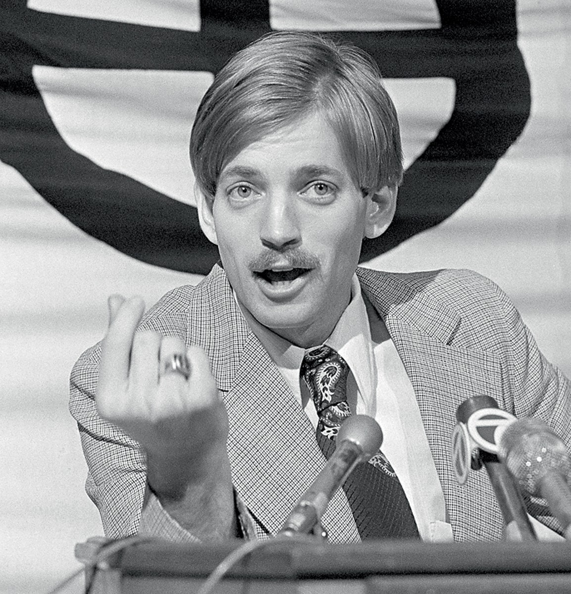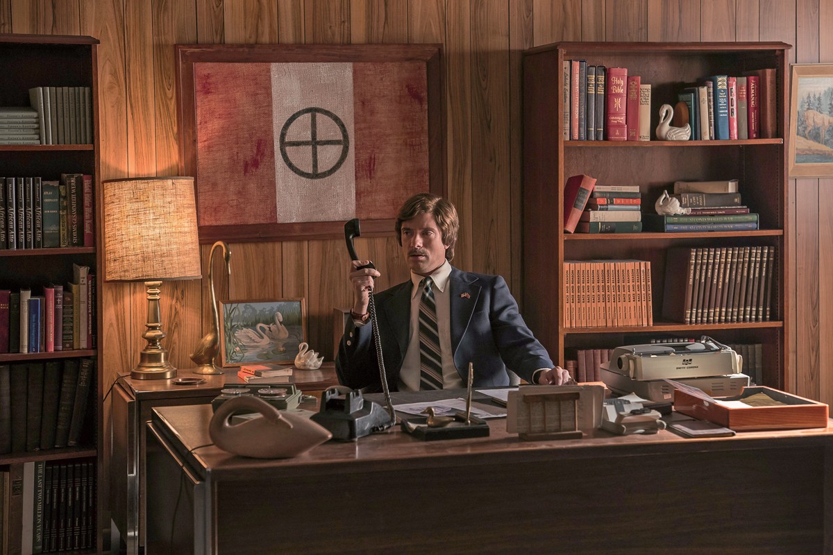 Кадр из фильма «Черный клановец» Гардероб ультраправого националиста, руководителя ку-клукс-клана Дэвида Дюка (Тофер Грейс), — не только стилизация эпохи, но и стратегия. «Мы должны были сделать так, чтобы организация выглядела респектабельно, поэтому для ее главы я подобрала несколько строгих однотонных костюмов и полосатых галстуков», — рассказывает дизайнер.