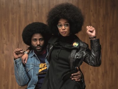Кадр из фильма «Черный клановец» При создании костюмов для возлюбленной Рона, активистки Патрис (Лора Хэрриер), художница вдохновлялась образами реальных борцов за права темнокожих: экс-члена Партии черных пантер (организация, которая продвигала гражданские права темнокожего населения, — THR) Кэтлин Кливер и феминистки и профессора Калифорнийского университета Анджелы Дэвис. В 1970-е обе носили длинные куртки, водолазки, ботфорты и гордились своей роскошной афрошевелюрой. Примерно такой образ и достался Хэрриер, а к вышеперечисленным элементам добавились укороченные джемперы, пончо и мини-платья A-силуэта. Доминирующий цвет — черный. «Это ее униформа», — подчеркивает Роджерс.