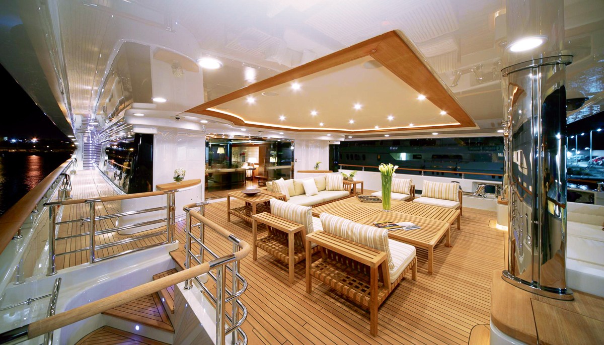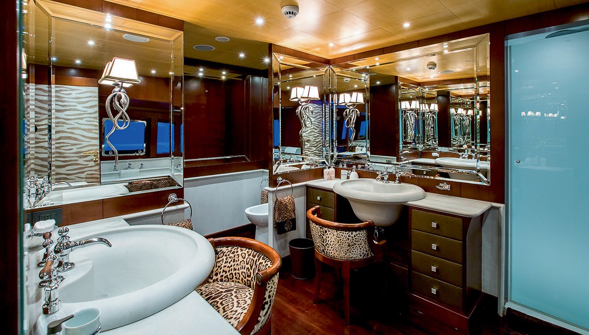 Анималистичные принты, спокойные расцветки, искусственный мех, кожа — дизайн интерьера Ability напоминает творчество самого модельера. А глянцевый корпус, переливающийся фиолетовым, синим и зеленым, делает судно узнаваемым издалека. В каждой из пяти кают есть Wi-Fi и отдельная ванная комната. А для любителей провести вечер на свежем воздухе — палуба, оборудованная домашним кинотеатром. Яхту построила одна из самых известных верфей Baglietto в 2004-м, но многочисленные модификации под все новые и новые запросы владельца продолжались вплоть до 2016 года.