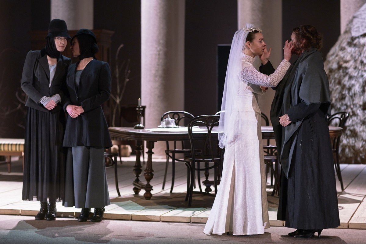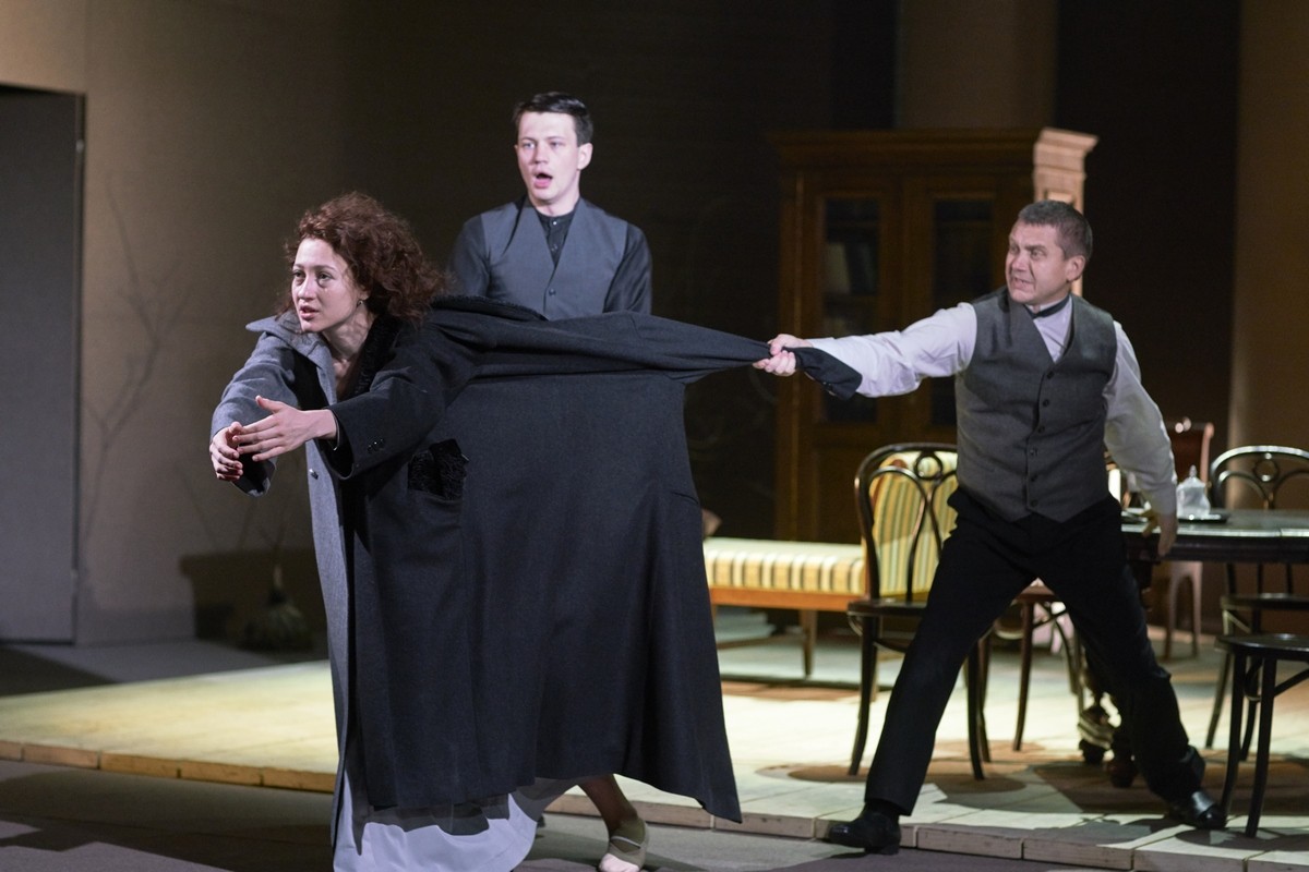 Фото: Сергей Петров «Все смешалось в доме Облонских» - первое, что приходит на ум при беглом знакомстве с программкой спектакля, больше похожей на киносценарий. Сначала будет Пролог: «Везде и нигде». Как всякий большой роман, спектакль разбит на две части. В первой зрителю предстоит побывать в ХIХ веке, сначала в гостях у Левина в селе Покровском, потом в Москве, в доме его возлюбленной Кити, опять вернуться в Покровское, затем еще раз отправиться в Москву. Ближе к концу Первой части, то есть первого акта, перенестись в век ХХ, в имение графа Толстого. А во второй части и вовсе оказаться внутри романа «Анна Каренина», чтобы затем опять совершать путешествие во времени и пространстве, перемещаясь из Москвы века ХIХ в Ясную Поляну начала века ХХ. В общем, голова идет кругом от этих «перемещений». Но вот открывается занавес, спектакль начинается, и оказывается, нет в нем никакой путаницы. Вполне закономерно появление героев из «Анны Карениной», романа, в котором по признанию самого Толстого ему «была близка мысль семейная». Но и в романе, и в судьбе самого писателя эта жизнь семейная потерпела крах. Драматург Марюс Ивашкявичус признался, что именно это и взял за основу своей пьесы. Это пояснение драматурга – ключ к пониманию необычной, довольно сложной структуры спектакля, гдесамой трагичной фигурой предстает Софья Андреевна, а о личной драме самого Льва Николаевича приходится только догадываться. Сам он в спектакле так и не появится. В Прологе зрители услышат как будто его голос из вечности. Но, может, этот голос лишь звучит в голове самой Софьи (именно по под этим именем она выведена в спектакле), задающей туда, в вечность, мучающие ее вопросы ?