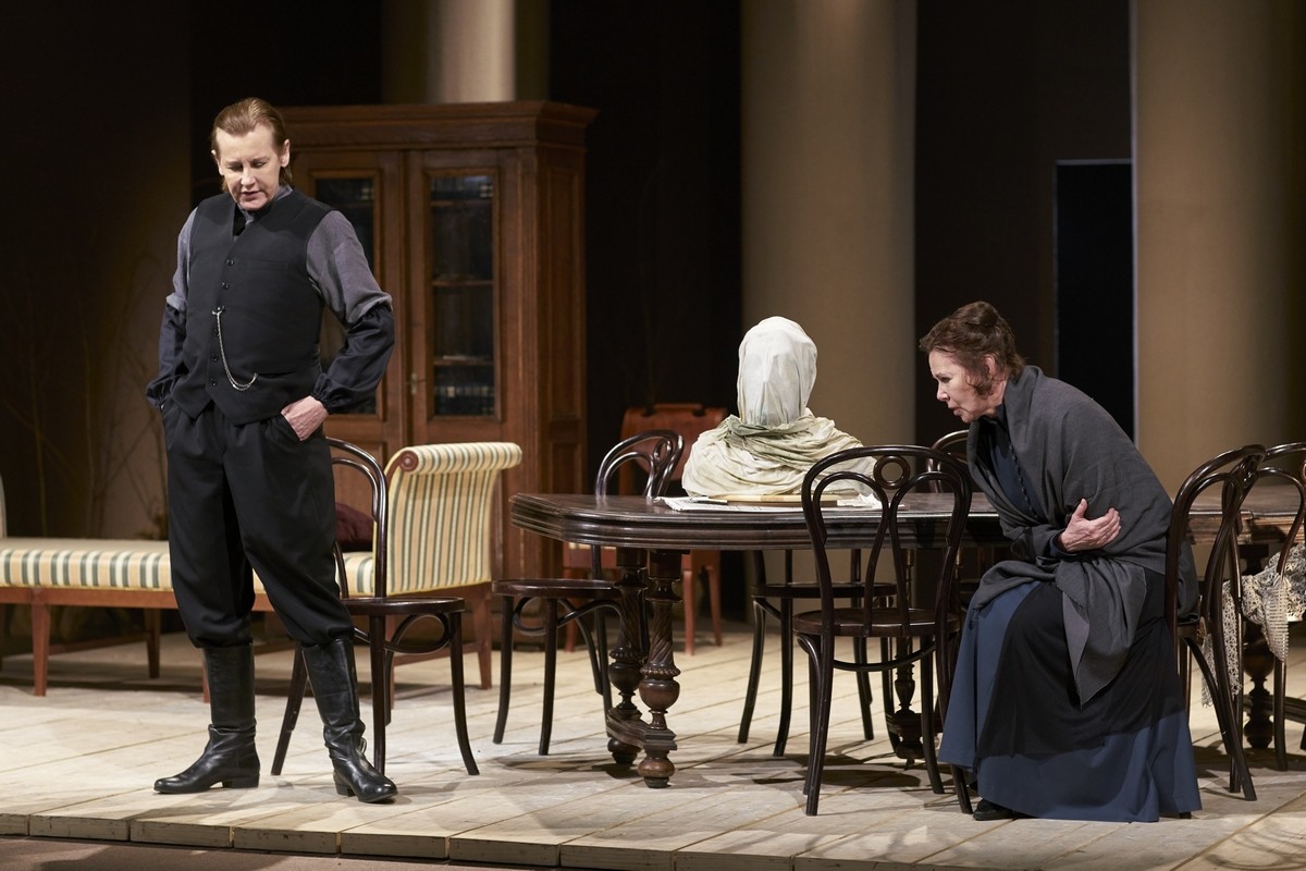 Татьяна Орлова и Евгения Симонова в спектакле «Русский роман» Эвелина ГурецкаяИменно за роль Софьи, главной женщины в жизни Льва Толстого, народная артистка России номинирована на премию «Золотая Маска».Евгения Симонова в театре имени Маяковского служит 40 лет, где у нее было множество ярких ролей. Но роль Софьи в спектакле «Русский роман», главной женщины в жизни гения русского романа Льва Николаевича Толстого, пожалуй, впервые соответствует масштабу таланта и личности самой актрисы. Не случайно именно за эту роль народная артистка России номинирована на премию «Золотая Маска». Номинаций на главную театральную премию страны у этого спектакля в общей сложности пять. Это и сам спектакль, и режиссер постановщик, художественный руководитель театра Миндаугас Карбаускис, и даже автор пьесы, по которой и поставлен спектакль, литовский драматург Марюс Ивашкявичус. Драматург написал пьесу в духе времени, когда многие согласны с утверждением «мысль материальна», а ученые приходят к выводу, что наш мир состоит из энерго-нформационых полей. Значит, какие-то события в своей жизни мы формируем сами. Марюс Ивашкявичус эти соображения практически подтверждает : «Русский роман» – это своеобразная семейная сага, вариация на тему романа «Анна Каренина», в которой Лев Николаевич Толстой выступает не только как автор своего шедевра, но и как автор своей же семейной драмы. Бывают романы, построенные на жизни автора. Но бывают и такие, которые в будущем строят жизнь автора. Либо ее ломают. И тогда в этом слиянии реального и художественного автор становится самой трагичной фигурой своих творений».