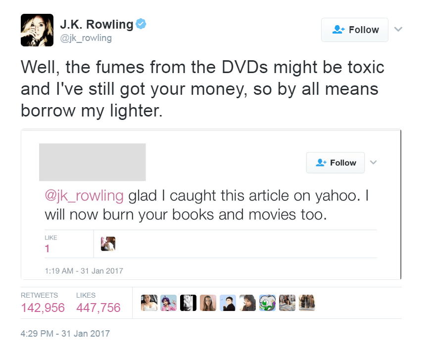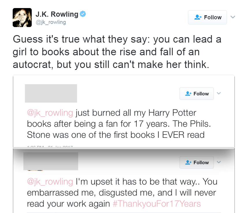 В итоге писательница поблагодарила тех, кто пишет ей слова поддержки и солидарен с ее точкой зрения касательно Трампа. Вообще Роулинг не впервой сталкиваться с тем, что ее книги сжигают. В начале 2000-х ряд радикальных религиозных групп устроили подлобные акции, считая книги о юном волшебнике в очках сатанинскими и вредными. В ответ на новости о том, что ее книги даже запретили в нескольких школах по тем же религиозным причинам, Роулинг сообщила, что ее это не волнует ни капли: «Теперь я встретила тысячи детей, и множество раз они ко мне подходили с огромной благодарностью и словами, что теперь они хотят быть волшебниками и ведьмами».
