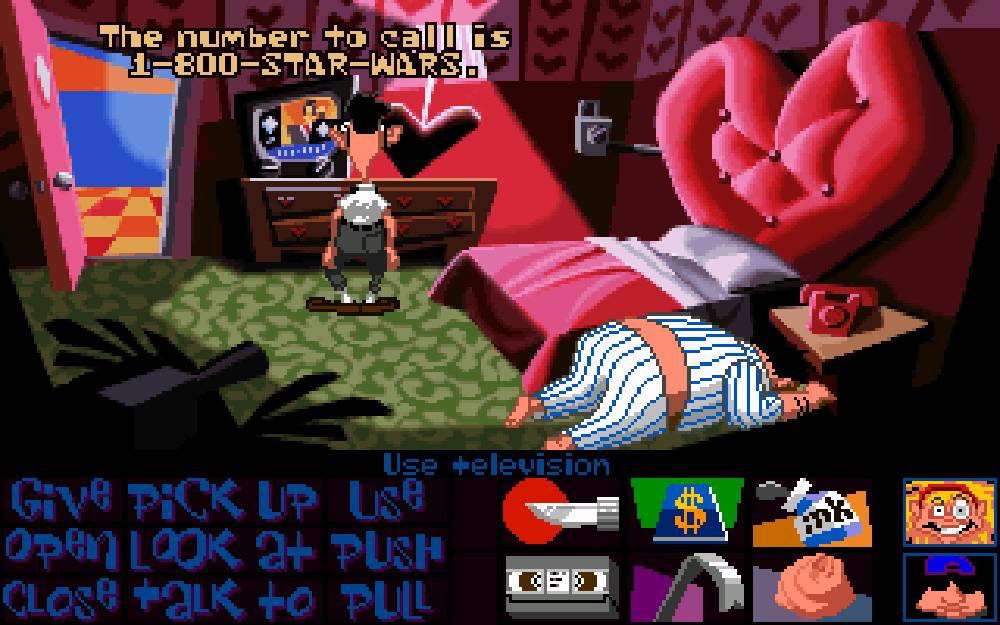 Самое главное, что дала разработка Labyrinth студии – это вектор движения. Буквально в следующем году выходит Maniac Mansion – пародийный квест, высмеивающий жанр хоррор и впервые показывающий абсолютно новую схему управления – так называемую “Point’n’click”, «наведи-и-нажми». Больше никакого ввода текста, абсолютно все действия отныне выполняются с помощью мыши. Дейв Миллер и его друзья отправляются спасать девушку Дейва из лап безумного ученого, чей разум захватил разумный метеор. Используя сильные и слабые стороны Дейва и двух из его друзей, игрок должен был пройти через особняк ученого, решая головоломки и спасаясь от смертельных ловушек. Примечательно, что прохождение сильно различалось в зависимости от того, кого из друзей игрок выбирает в сопровождение Дейву. В зависимости от того, как именно игрок пройдет игру и кто из его друзей выживет в конце, можно было получить один из пяти различных финалов.