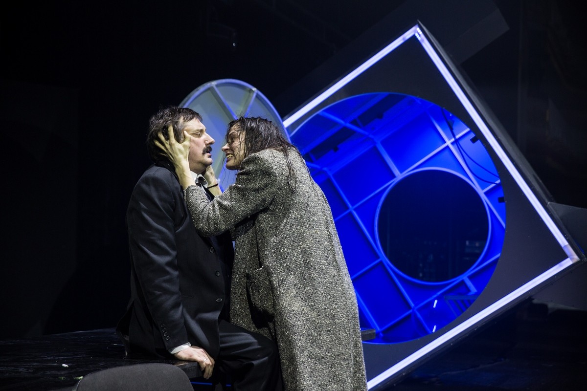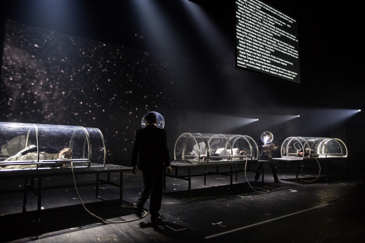 Фото: Катерина Кравцова Режиссер отправляет сестер на некую отдаленную космическую станцию, обозначив расстоянии до Земли в сотни тысяч световых лет. И для них опять будет так же недостижима Москва, какой она была при их жизни в российском губернском городе на рубеже 20-го века. Попытается режиссер заглянуть и в подсознание сестер, придав определенную мотивацию их поведению и поступкам и переиначив таким образом первоисточник. Помогут ему в этом остальные чеховские герои. Из большого куба вблизи первого зрительского ряда появится Вершинин (Игорь Волков). Публика видит и его появление, и другие сцены внутри этого куба с помощью установленной там камеры. Почему именно его, смешного, немолодого, с приличным животиком, выбрала Маша? Режиссерская версия такова: да потому, что испытывала сексуальное влечение к отцу (вспомним старика Фрейда). Маша постоянно повторяет, как она его любила, а в сновидениях даже склонна к инцесту. Для иллюстрации этих чувств у Жолдака отец таки появится в глубине пространства, старик (тот же Игорь Волков) в каком-то доме престарелых под Варшавой, очевидно, тот же плод воображения – или сна? – Маши.