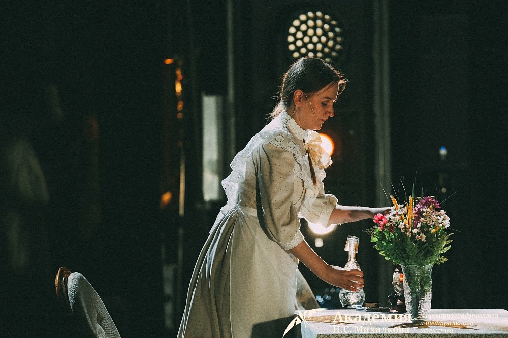 Перед началом спектакля зрителям показывают видео о том, как придумывали, репетировали, помогали друг другу, а еще и мастер-классы с основателем Академии. Во время спектакля он уже в зрительном зале, наблюдет за тем, как его ученики справляются с заданием. Причем, режиссерам (над этим спектаклем работали Вера Камышникова, Александр Коручеков, Игорь Яцко) и слушателям Академии предоставлено право самим выбирать то или иное произведение классиков, а его, Михалкова, право принять или не принять предлагаемое сценическое решение. Например, актриса Ольга Озоллапиня выбрала бунинский рассказ «Муза» и блестяще справилась с ролью. «Когда прочитала “Музу”, зацепило, почему так она поступила, почему так она сделала, это очень интересно». В прошлом она актриса «Студии театрального искусства Сергея Женовача», в Академию попала только с третьей попытки. Слушатели Академии все с базовым профессиональным образованием, попасть сюда непросто, конкурс порой доходит до ста человек на место. Но обучение у Михалкова того стоит. «Самая радостная и вдохновляющая метаморфоза, которая происходит внутри нашей Академии, это метаморфоза постижения нашими студентами-актерами новых приемов и методов. Каждый год из стен Академии выходят профессионалы, которые могут решать любые творческие задачи, могут компенсировать любой вакуум режиссерского профессионализма. Наши выпускники не просто отлично владеют актерским ремеслом, но и являются абсолютно самодостаточными – вижу в этом главный смысл и достижение нашей Академии кинематографического и театрального искусства», – признался Никита Сергеевич. И впрямь, глядя на сцену невозможно не восхититься мастерством перевоплощения артистов Софьи Куцерубовой, Игоря Сергеева и той же Ольги Озоллапиня в инсценировке «Рассказа госпожи NN» Чехова.
