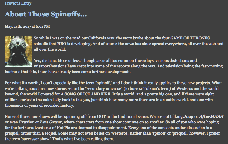 «Каждый проект, который сейчас обсуждается, — это приквел, а не сиквел. Некоторые из сюжетов даже разворачиваются не на Вестеросе. Понятиям "спин-офф" и "приквел" я предпочитаю термин "преемник"», — рассуждает писатель. Также он подчеркнул, что поклонников, которые ждут непременное развитие историй любимых персонажей в будущем - после оригинального сериала - ждет разочарование. Также телепроекты не будут касаться серии книг «Повесть о Дунке и Эгге». По словам Мартина, зрителей ожидает пять новых проектов со вселенной «Игры престолов» и ее литературной основы — «Песни Льда и Огня», которую Мартин никак не может спокойно закончить. Как минимум в четырех из новых шоу писатель будет задействован соственной персоной. Пятым проектом займется «отличный сценарист», однако имя драматурга писатель раскрывать отказался. сколько пилотов в итоге будет снято, и сколько из них станет полноценным сериалом, покажет лишь время.
