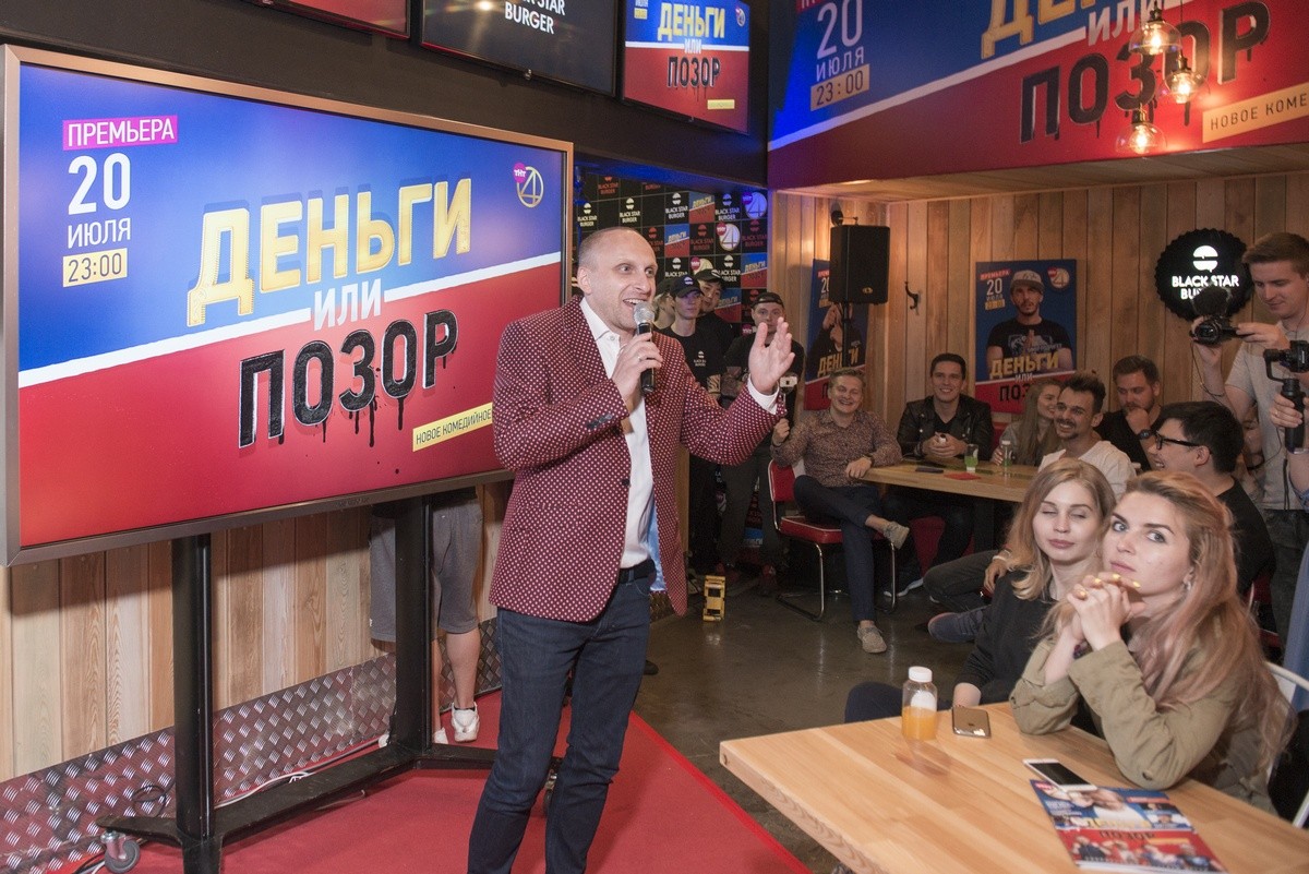 Дядя Витя, Гавриил Гордеев и журналисты на презентации «Деньги или позор» Ольга БеликВ новом шоу дядя Витя будет позорить звезд за деньги – и свои навыки он продемонстрировал приглашенной прессе.Канал ТНТ4 представил журналистам свое новое комедийное шоу «Деньги или позор», премьера которого состоится 20 июля в 23:00. По условиям шоу каждый гость получает от ведущего дяди Вити солидную сумму денег – миллион рублей. После этого дядя Витя начинает рассказывать самые откровенные, нелепые, а главное — правдивые факты из жизни собеседника. Если герой программы захочет скрыть какую-либо информацию о себе, то он может откупиться, лишившись некоторой суммы. В этот момент и происходит главный выбор — деньги или позор. Участниками шоу стали звезды ТНТ: Тимур Батрутдинов, Настасья Самбурская, Мигель, Тимур Родригез и директор телеканала ТНТ4 Гавриил Гордеев. Специально для шоу рэпер L’One написал новый трек.