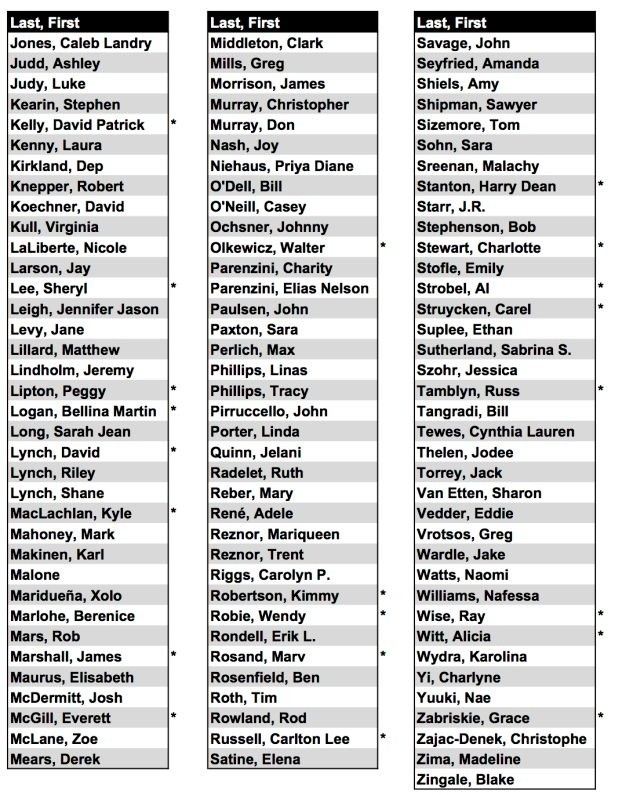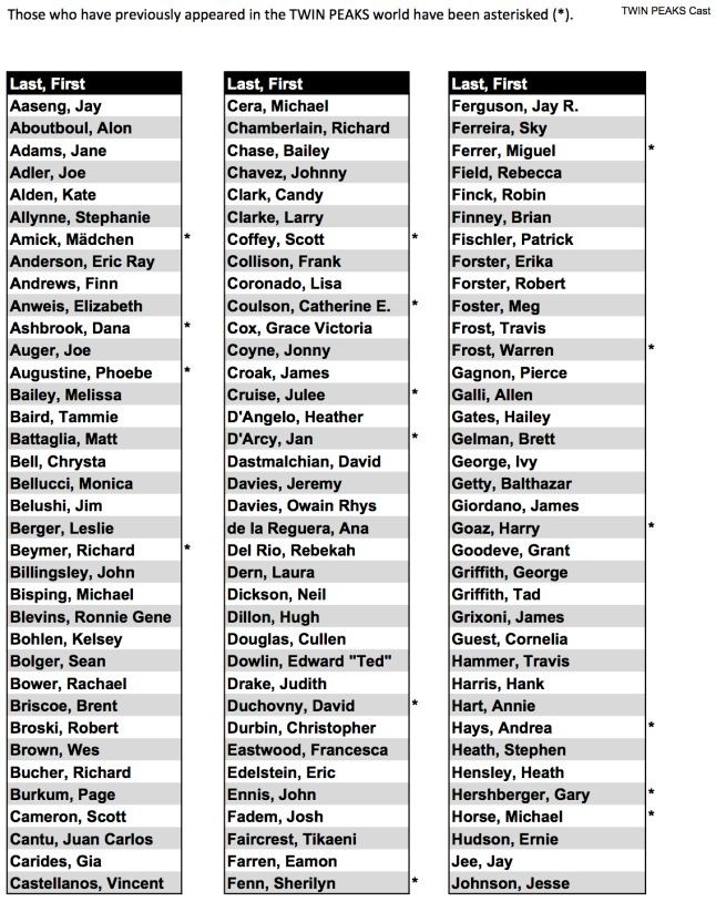 Линч опубликовал список 217 актеров, которые снялись в сериале. Помимо вышеперечисленных артистов, в него вошли Тим Рот, Моника Беллуччи, Джим Белуши, Дэвид Духовны, Эрни Хадсон, Джош МакДермитт, Эдди Веддер из Pearl Jam, Трент Резнор из Nine Inch Nails и многие другие. Какие роли им достанутся, не сообщается. Вероятно, большинство появится в небольших камео.