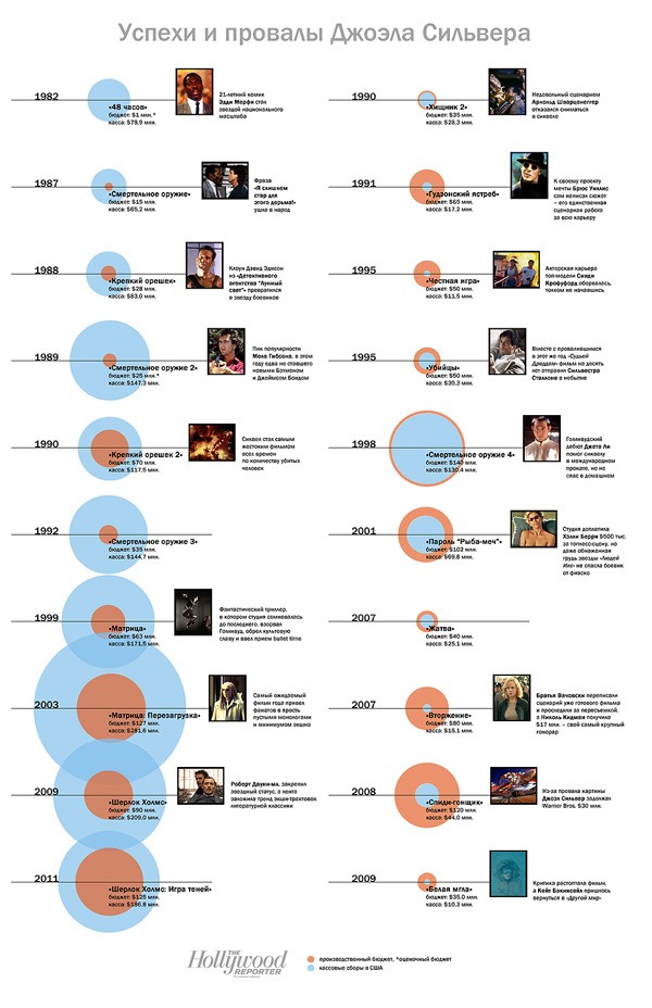 Под его началом начал работать золотое перо экшна Шэйн Блэк, написавший четыре серии «Смертельного оружия», а в следующем году возвращающийся в режиссуру «Железным Человеком 3». Это Сильвер поверил в братьев Вачовски, в начале 90-х купив за $1 млн. сценарий киберпанка «Матрица», а в конце тысячелетия убедив Warner Bros. профинансировать фильм, ставший одним из самых знаковых явлений в кинофантастике. С ним работали Ричард Доннер и Дэниел Крэйг, Сильвестр Сталлоне и Гай Ричи, на его счету четыре успешные франшизы – помимо упоминавшихся «Смертельного оружия» и «Матрицы» это «Крепкий орешек» и «Шерлок Холмс». И все-таки студия решила не продолжать сотрудничество с его компанией Silver Pictures. Насколько финансово обоснован этот ход, судите по нашей инфографике с десяткой основных кассовых и провальных картин Джоэла Сильвера.