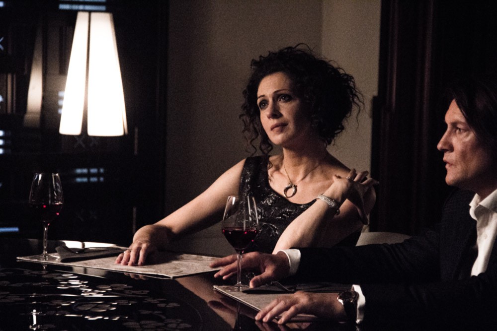 Кадр из фильма «Дама пик» Однако главное — в особенности для тех, кто не слишком хорошо знаком с «Пиковой дамой», — это общая эстетика картины. В ней театрально и оторвано от окружающей нас действительности чуть более чем все. Это касается и повседневной одежды героев, и антуража помещений (особенно нелепого в своей помпезности загородного дома героя Игоря Миркурбанова, старого друга-олигарха Майер, у которого она и поселилась на время возвращения в Россию), и игры актеров — нарочитой и слишком акцентированной для кино.