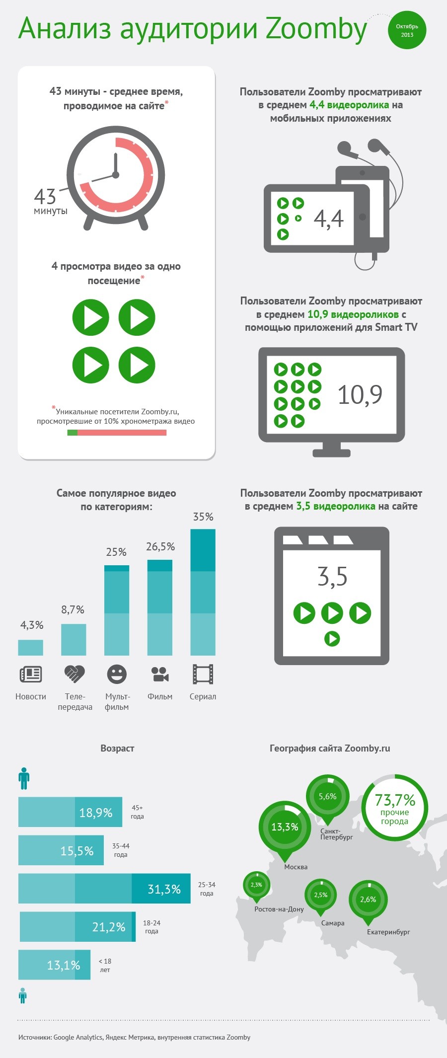 Ядро аудитории Zoomby - пользователи в возрасте 25-34 лет, при этом видеосервисом пользуются 51% женщин и 49% мужчин. Мужчины тоже любят смотреть сериалы — боевики и детективы. Кстати, сериалы НТВ смотрят, в основном, мужчины.