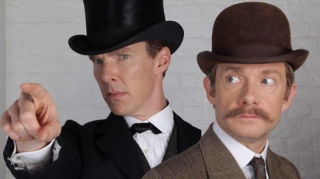 Создатели «Шерлока» заинтриговали поклонников телешоу, разметив в твиттере фотографию с Бенедиктом Камбербатчем и Мартином Фриманом, которые одеты в стиле викторианской эпохи. Цилиндр Холмса и густые усы доктора Ватсона — значит ли это, что герои британского сериала в рождественском выпуске посетят Лондон конца XIX века? Вполне возможно, учитывая название хэштега, размещенного под фото: #notkidding («мы не шутим»).
